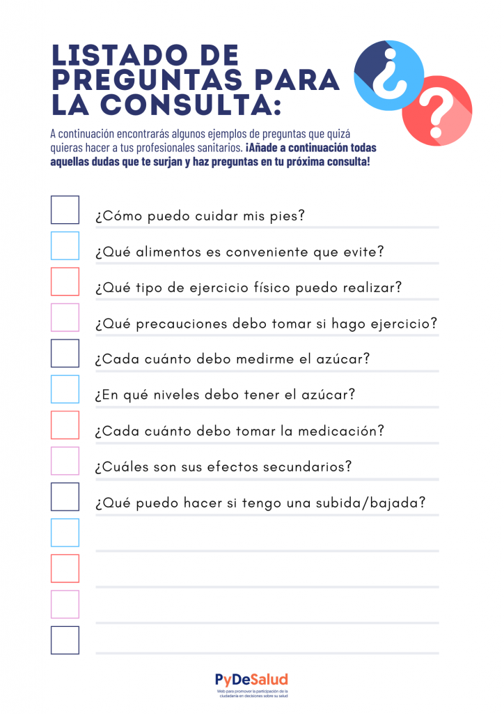 A continuación, se presentan una serie de recomendaciones para ayudar a las personas con diabetes tipo 2 a preparar las consultas con los profesionales sanitarios que las asistan, de forma que puedan sacarles el máximo rendimiento a esos encuentros: